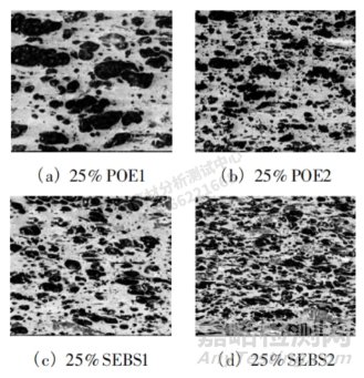 通過透射電子顯微鏡觀察了彈性體在 PP 的 分散情況,結(jié)果見圖 4,取樣位置與多軸沖擊破壞位置相同,均是樣板正中位置。對比圖 4 (a) 和圖 4(b) 可以看出: POE2 的熔指高于POE1,因而在 PP 共混體系中橡膠粒徑較細(xì)。同樣,在SEBS / PP通過透射電子顯微鏡觀察了彈性體在 PP 的 分散情況,結(jié)果見圖 4,取樣位置與多軸沖擊破壞位置相同,均是樣板正中位置。對比圖 4 (a) 和圖 4(b) 可 以看 出: POE2 的熔指高于 POE1,因而在 PP 共混體系中橡膠粒徑較細(xì)。 同樣,在 SEBS / PP