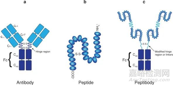 由于內(nèi)源性藥物是體內(nèi)為維持生命所產(chǎn)生的生物物質(zhì),具有代謝反應(yīng)半衰期較短、穩(wěn)定性差缺點(diǎn),對(duì)pH值、金屬離子、溫度等環(huán)境因素較為敏感。為增強(qiáng)藥物的穩(wěn)定性和半衰期,小分子藥物一般使用化學(xué)修飾的方式;大分子藥物則采用化學(xué)修飾和與大蛋白融合等方式。最常見的技術(shù)是Fc融合蛋白、血清白蛋白融合蛋白和轉(zhuǎn)鐵蛋白融合蛋白[2] [3]。其中,F(xiàn)c融合蛋白是指通過(guò)基因工程技術(shù)將功能蛋白與抗體的Fc片段融合而成(圖1)。這種融合策略不僅保留了功能蛋白的生物活性,而且延長(zhǎng)了半衰期,提高了穩(wěn)定性,有利于融合蛋白的表達(dá)、純化和檢測(cè)[4]。