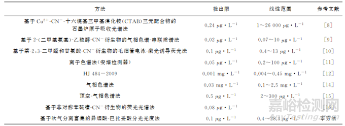 將本方法與文獻(xiàn)報道的其他氰化物檢測方法進(jìn)行比對,結(jié)果見表2。