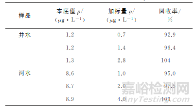 按照試驗方法對實際井水和河水進(jìn)行預(yù)處理和測定,并對其進(jìn)行加標(biāo)回收試驗,結(jié)果見表1。由于本方法是按照 HJ 484—2009中總氰化物的測定要求進(jìn)行水樣預(yù)處理,因此測得的氰化物為水中總氰化物,包括全部簡單氰化物和絕大部分絡(luò)合氰化物。