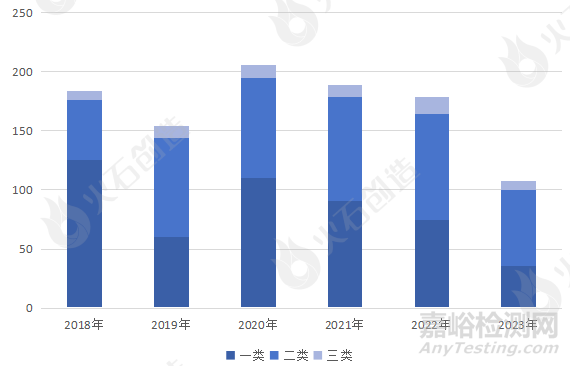 2018年1月至2023年10月,國家藥監(jiān)局共披露醫(yī)療器械生產(chǎn)資質(zhì)批1020件,涉及企業(yè)843家,其中可生產(chǎn)一類、二類、三類的企業(yè)分別為497家、461家和62家。