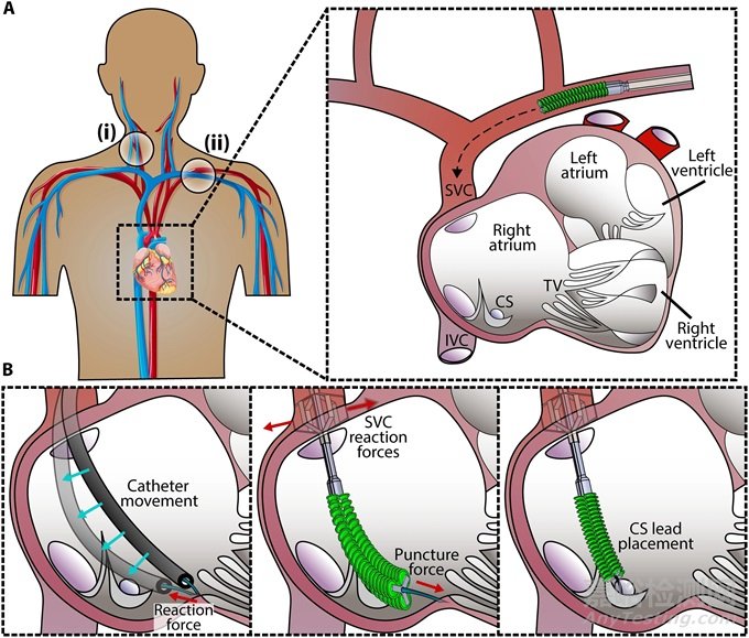 A) 該裝置通過上腔靜脈通過兩個(gè)外周進(jìn)入部位之一朝右心房移動:(i) 右頸內(nèi)靜脈或 (ii) 左鎖骨下靜脈。B) 左圖:說明傳統(tǒng)導(dǎo)管當(dāng)前面臨的挑戰(zhàn),其靈活性使得施加力和精確控制位置非常困難。中:所提出的裝置可以靠上腔靜脈自我穩(wěn)定,以最大限度地減少遠(yuǎn)端力損失。這種穩(wěn)定性以及軟機(jī)器人尖端使用戶能夠執(zhí)行三尖瓣環(huán)形錨植入和冠狀竇起搏器引線放置等手術(shù)。圖示機(jī)器人將錨部署到三尖瓣環(huán)中。右圖:機(jī)器人將導(dǎo)絲引導(dǎo)至冠狀竇。(圖片來自原文)