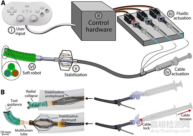A) 該設(shè)備工作流程分為六步:(i) 用戶使用 Nintendo Wii Classic 控制器控制軟機(jī)器人的流體室。(ii) 用戶輸入由 Arduino Leonardo 微控制器解釋。(iii) 微控制器向三個(gè)線性電機(jī)(Actuonix,S20)發(fā)送信號,驅(qū)動各自的注水注射器。(iv) 用戶通過拉動注射器柱塞來部署穩(wěn)定機(jī)構(gòu),這會在鮑登纜線中產(chǎn)生張力。(v) 作為步驟 (iv) 的結(jié)果,穩(wěn)定機(jī)構(gòu)針對上腔靜脈 (SVC) 展開。(vi)通過步驟(i)至(iii)來控制軟機(jī)器人。B) 軟機(jī)器人組件能夠徑向收縮至 8 毫米的設(shè)備直徑,使其在穿過脈管系統(tǒng)時(shí)能夠穿過管腔。此外,用于穩(wěn)定機(jī)構(gòu)的鮑登電纜的末端穿過魯爾鎖閥并進(jìn)入注射器,使用戶在拉動電纜后鎖定穩(wěn)定裝置。(圖片來自原文)