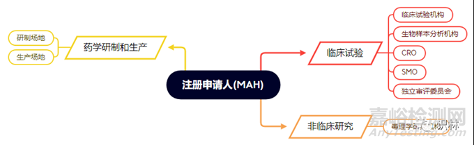 (2)申請(qǐng)人企業(yè)對(duì)于自己的合規(guī)信息可以做到充分收集和保存,但對(duì)產(chǎn)品從研發(fā)走到臨床結(jié)束的其他相關(guān)方的信息就會(huì)缺失。在本文件中是分別介紹了藥學(xué)研制與生產(chǎn)、藥物臨床試驗(yàn)、藥理毒理學(xué)研究三大部分的合規(guī)信息內(nèi)容要求的。因此,與一個(gè)要注冊(cè)申請(qǐng)的藥品有關(guān)的主體不止申請(qǐng)人企業(yè)一家,至少就有下圖所示的多個(gè)不同角色