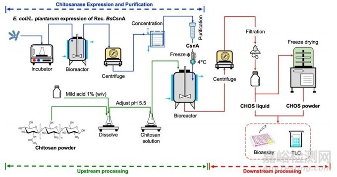 由于CHOS相對于化學(xué)和物理方法的優(yōu)勢,以及控制降解反應(yīng)的能力,因此采用酶水解法生產(chǎn)CHOS。本研究中小規(guī)模和大規(guī)模的CHOS生產(chǎn)示意圖如圖1所示。該過程可分為3個主要部分。首先利用大腸桿菌或食品級植物乳桿菌的表達(dá)來生產(chǎn)重組BsCsnA,然后將殼聚糖粉末溶于溫和酸中的CHOS生產(chǎn)的上游進(jìn)行加工,最后是CHOS溶解的下游加工過程。