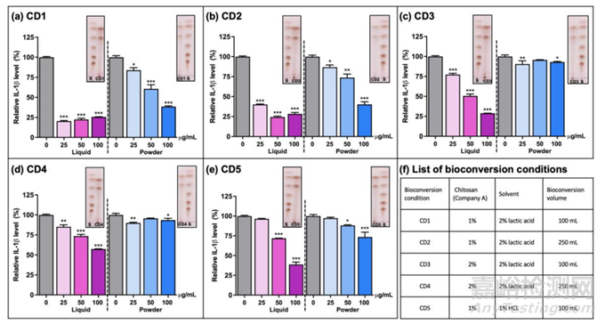 在48 h時收集最終的水解產(chǎn)物。對使用鹽酸或乳酸的反應(yīng)實現(xiàn)100%的生物轉(zhuǎn)化,即殼聚糖解聚。接下來使用五種不同的處理條件(CD1-5)產(chǎn)生不同CHOS產(chǎn)物的抗炎特性,使用先前建立的基于測量LPS誘導(dǎo)巨噬細(xì)胞中分泌的IL-1β(圖2)。雖然效果大小存在差異,但所有CHOS制劑都顯示出抗炎活性。一般來說,液體材料比粉末狀(凍干)材料效果更好。乳酸中產(chǎn)生的液體和粉末狀CHOS(圖2a)的抗炎活性均優(yōu)于鹽酸中產(chǎn)生的CHOS(圖2e)。通過質(zhì)譜檢測CD1 - CD5反應(yīng)的最終產(chǎn)物混合物中的CHOS(圖2f)。