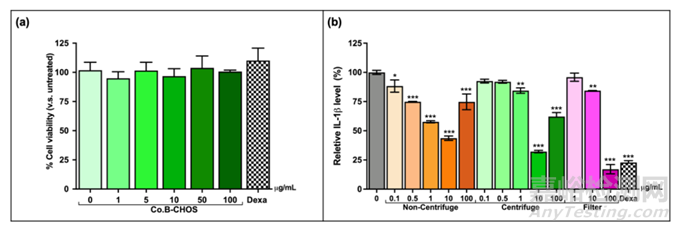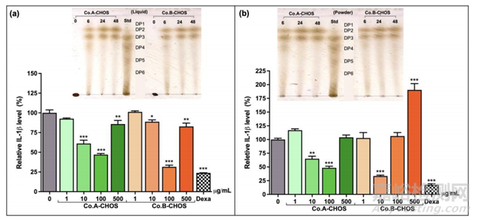本研究中使用的殼聚糖由泰國兩家成熟的殼聚糖供應(yīng)商提供,分別指定為A公司(Co. A)和B公司(Co.B)。Co. A的殼聚糖是食品級的,呈灰白色外觀,由熱帶海洋干蝦殼產(chǎn)生。Co.B的殼聚糖為飼料級,灰白色薄片。圖3顯示所得液體和粉末狀CHOS制劑的薄層色譜分析和抗炎活性。總的來說,Co. A和Co.B的CHOS產(chǎn)物模式相同,二聚體和三聚體占主導(dǎo)地位。兩種CHOS制劑均顯示出抗炎作用。這些觀察表明,CHOS的生物活性和可能的副作用取決于部分殼聚糖來源,從不同生產(chǎn)過程中獲得的CHOS產(chǎn)品的整體結(jié)構(gòu)微小差異可能導(dǎo)致對人類細(xì)胞的生物效應(yīng)的重大差異。