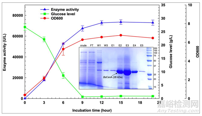 在5-L生物反應(yīng)器中分泌產(chǎn)生重組BsCsnA的結(jié)果如圖4所示。在OD值為600nm時,細(xì)胞密度增加(紅線)與培養(yǎng)基中BsCsnA活性增加相一致(藍(lán)線)。孵育15 h時,酶活性達(dá)到74000 U/L。植物乳桿菌的生長與培養(yǎng)基中葡萄糖的減少(綠線)相對應(yīng)。該酶可以從培養(yǎng)上清液中純化。