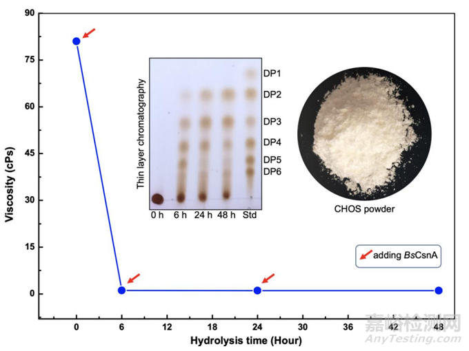 通過薄層色譜法和測量反應(yīng)混合物的粘度來監(jiān)測產(chǎn)物的形成(圖5)。TLC結(jié)果顯示,6h后可檢測到CHOS,主要是DP3、DP4和DP5。水解48 h后,CHOS主要由二聚體和三聚體組成。
