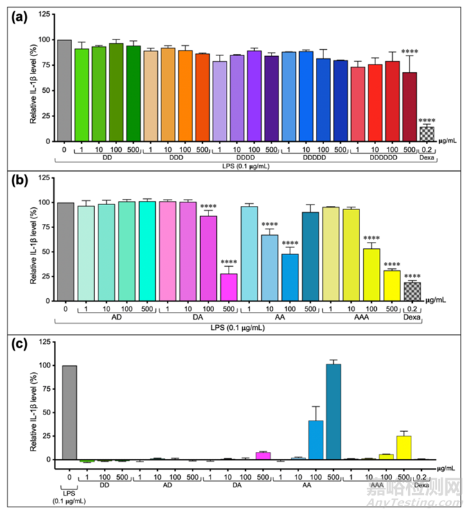 用濃度為1~500ug/mL各種標(biāo)準(zhǔn)低聚糖,即D2、D3、D4、D5、D6、DA、AD、AA和AAA檢測其抗炎活性。結(jié)果證實CHOS的生物活性受到乙?;J降挠绊懀▓D7)。去乙?;牡途畚铮―2-D6)除高劑量的六聚體外,只有輕微的抑制作用(圖7a)。相反,非乙酰氨基葡萄糖的二聚體(AA)和三聚體(AAA)均表現(xiàn)出較強(qiáng)的抗炎活性(圖7b)。比較四種二聚體(DD、DA、AD、AA)的活性,結(jié)果表明還原端A(N-乙酰氨基葡萄糖)是CHOS生物活性的關(guān)鍵。DA輕微誘導(dǎo)炎癥,AA誘導(dǎo)IL-1b分泌明顯強(qiáng)于AAA(圖7c)。以上結(jié)果證實乙酰化程度(DA)可以極大地影響CHOS的抗炎活性。