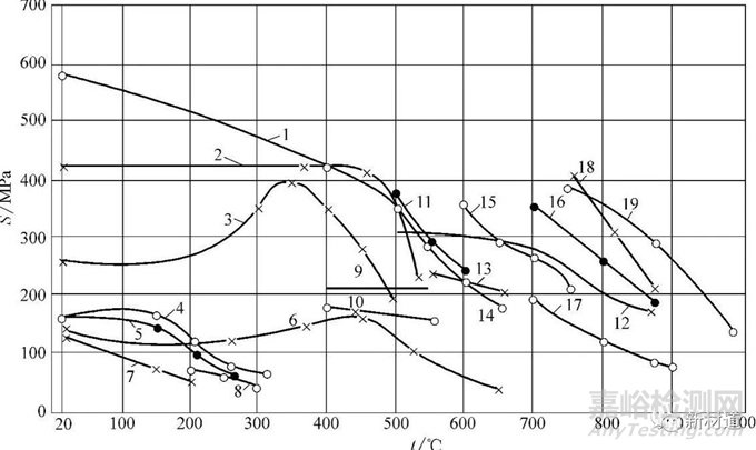 圖1可以看出:鋁合金和鎂合金只適用于200~300℃的溫度;低碳鋼在300~400℃疲勞強度達到最大值;高強度鑄鐵在450℃以下疲勞強度略有升高;低合金鋼在低于500℃的溫度下能保持很高的疲勞強度;當溫度超過600℃以后,奧氏體鋼的疲勞性能比碳鋼和低合金鋼好;當工作溫度超過750℃以后,鐵基合金被鎳基合金或鈷基合金所取代。從圖中還可看出,除低碳鋼和鑄鐵以外,其他金屬的疲勞強度均隨溫度的提高而降低。低碳鋼和鑄鐵的這種反?,F(xiàn)象是由循環(huán)應變時效引起的。