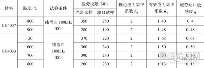 表4 缺口對兩種合金不同溫度下疲勞極限等數(shù)據(jù)的影響