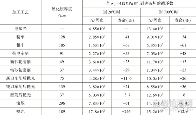 3、表面加工對疲勞強度的影響隨溫度的上升而降低。各種加工工藝對鎳基合金(CrNi77TiAl)試樣疲勞壽命的影響見表5。