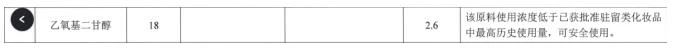 1)產(chǎn)品為駐留類,該原料具有駐留類和淋洗類產(chǎn)品最高歷史使用量信息,但該原料的使用量超過駐留類產(chǎn)品最高使用量。如:乙氧基二甘醇(配方中使用濃度為18%,駐留類最高歷史使用濃度為2.6%,評(píng)估結(jié)論為該原料使用濃度低于已批準(zhǔn)駐留類化妝品中最高歷史使用量。