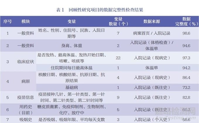 以新型冠狀病毒感染(COVID-19)相關(guān)研究項目進(jìn)行舉例,基于前文所述ESDR的工作流程,研究團(tuán)隊在某醫(yī)院的回顧性研究項目中部署了ESR工具,以檢查該項目的數(shù)據(jù)完整性(表1)。其中,模塊的內(nèi)容通常不是固定的,不同的研究項目可能會有不同的模塊和變量,其主要根據(jù)研究需要而進(jìn)行設(shè)計。每個研究項目可能會定義不同的模塊內(nèi)容,以確保收集和記錄與研究問題相關(guān)的數(shù)據(jù)。