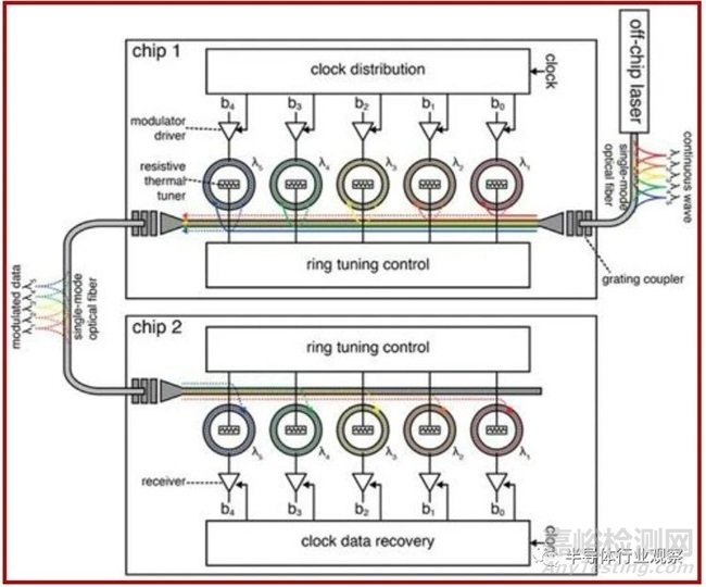 圖 3顯示了[10]中描述的 AyarLabs 方法的原理圖。右側的片外激光器輸入五種不同波長的復用光。在發(fā)射器中,對應于五個波長的 MRR 在單個波導中串聯(lián)排列。每個 MRR 均設計用于諧振調制五個輸入波長之一,而其他波長不受影響。類似地,對于接收,五個 MRR 串聯(lián)排列在一個波導上。它只吸收各個諧振波長的光信號(其他波長通過),進行光電轉換,獲得電信號。