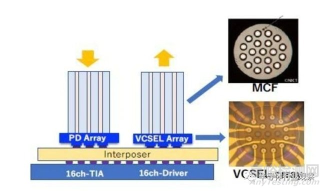 概述如圖 5所示。我們使用 16 芯光纖 (MCF),其中有 19 個單模芯。信號通過光學耦合到集成了每個位置對應的16個VCSEL和PD的二維陣列芯片,并傳輸數(shù)據(jù)。VCSEL使用InGaAs QW(量子阱)作為有源層,具有金屬孔徑(MA)結構,并以1060 nm的振蕩波長從背面發(fā)射光。發(fā)射的光為單模,模直徑約為5um。它耦合到單模芯(簡正模直徑 9um),無需透鏡。接收側也是背照式 InGaAs PD 的二維陣列,與光纖直接進行光耦合。