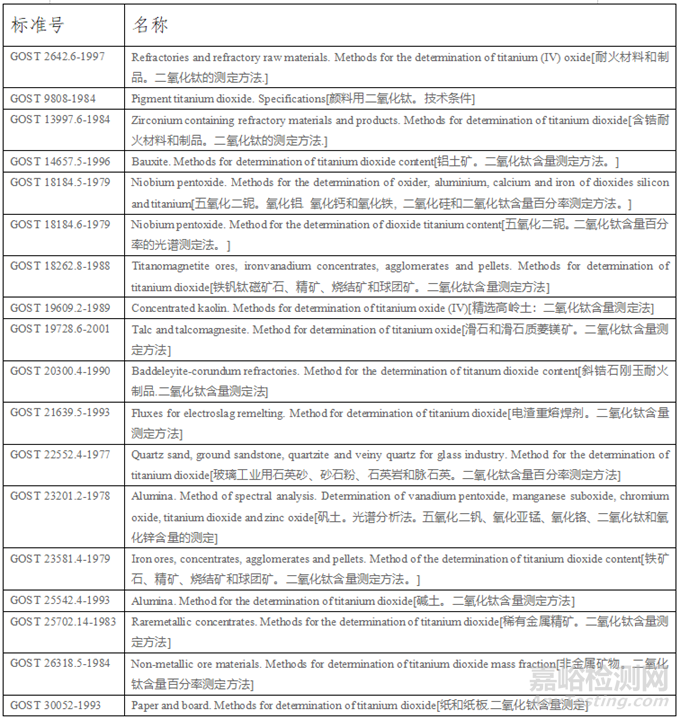 2.4俄國(guó)標(biāo)準(zhǔn)除耐火材料用、顏料用、紙和紙板用鈦白產(chǎn)品標(biāo)準(zhǔn)外,其余大多為各行業(yè)二氧化鈦含量的方法標(biāo)準(zhǔn);