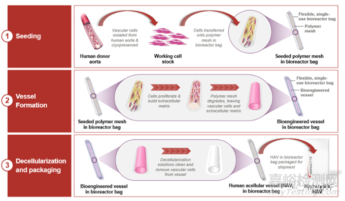 再將生物工程血管去細胞化以產(chǎn)生 HAV:一種細胞外基質(zhì),保留了血管的生物力學特征,但清除了可能誘導免疫反應的細胞成分。