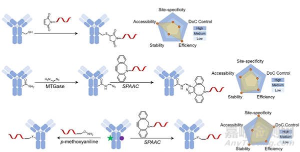 盡管AOC在臨床上取得了成功,但高保真偶聯(lián)技術(shù)的發(fā)展是發(fā)現(xiàn)AOC先導(dǎo)化合物的關(guān)鍵部分。在過去的十年里,能夠精確控制AOC位點(diǎn)特異性和化學(xué)計(jì)量的化學(xué)和生物學(xué)方法不斷進(jìn)步。這些技術(shù)得以確??贵w和寡核苷酸之間的牢固且精確的連接。此外,可及性、偶聯(lián)物穩(wěn)定性和生產(chǎn)效率等參數(shù)在決定臨床候選藥物的成功潛力方面也發(fā)揮著至關(guān)重要的作用。