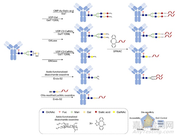 由于IgG在Fc區(qū)的CH2或CH3區(qū)的N297處攜帶兩條N-聚糖鏈,遠(yuǎn)離抗原結(jié)合區(qū),確定連接的有效載荷ON的數(shù)量和位置相對(duì)簡(jiǎn)單。例如,具有聚糖轉(zhuǎn)移活性的ENGase突變體(Endo-S,Endo-S2)可以產(chǎn)生具有同質(zhì)聚糖結(jié)構(gòu)的抗體。這種同質(zhì)聚糖結(jié)構(gòu)包含如疊氮化物和生物素的官能團(tuán),可以實(shí)現(xiàn)高效合成同質(zhì)AOCs,并精確控制藥物抗體比例在2至12之間。