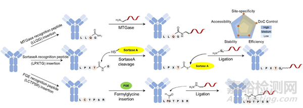 轉(zhuǎn)谷氨酰胺酶能夠在LLQG的谷氨酰胺側(cè)鏈與其伯胺之間形成共價(jià)鍵;分選酶a介導(dǎo)的轉(zhuǎn)運(yùn)可以將五甘氨酸修飾的藥物有效載荷轉(zhuǎn)移到LPETG基序上。另一種創(chuàng)新的化學(xué)酶方法是SMARTag®技術(shù)平臺(tái):利用這項(xiàng)技術(shù),甲酰基甘氨酸生成酶(FGE)可以將FGE識(shí)別基序(LCxPxR)中的半胱氨酸轉(zhuǎn)化為甲?;拾彼幔╢Gly),抗體就可以通過醛特異性化學(xué)轉(zhuǎn)化進(jìn)行化學(xué)修飾,從而產(chǎn)生均勻穩(wěn)定的偶聯(lián)物。