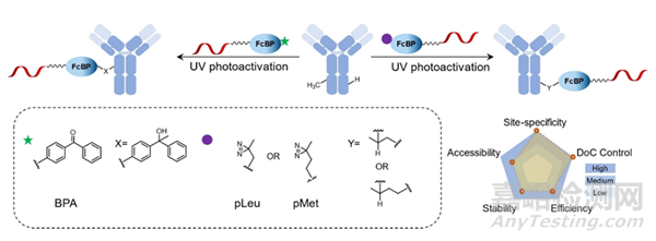 為了促進(jìn)抗體和寡核苷酸之間的誘導(dǎo)交聯(lián),已經(jīng)開發(fā)了許多高反應(yīng)性基序,如光交聯(lián)和化學(xué)交聯(lián)試劑,以在FcBP和靶抗體之間形成共價(jià)鍵。幾個(gè)可光活化的基團(tuán),包括二苯甲酮或馬來酰亞胺苯甲酰亞胺(MBP)、苯甲?;郊姿帷?duì)苯甲?;奖彼幔˙PA)、光亮氨酸(pLeu)和光甲硫氨酸(pMet),已成功地整合到FcBP中。光交聯(lián)的主要優(yōu)點(diǎn)是其高特異性,這是由于激發(fā)的中間體的壽命短。這種方法的缺點(diǎn)是可能生成具有一個(gè)或兩個(gè)標(biāo)簽的異質(zhì)性AOC。