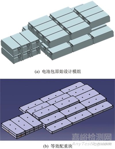 原電池包電池模組共有32個,分上下兩層,下層18個,上層14個,單個模組尺寸規(guī)格(長×寬×高)為355 mm×151.6 mm×108.5 mm,質量為11.4 kg,如圖2(a)所示。試驗時,電池包電池模組采用方形配重塊進行簡化處理,相鄰模組之間采用2 mm鐵塊連接。每個電池包配重塊等效設計為11.4 kg,尺寸為355 mm×151 mm×27.5 mm,材質為Q235,共32個,如圖2(b)所示,4角的孔為螺栓固定孔,固定在橫縱梁上。原電池布局重心主要分布在兩層電池包的中間層,因此,等效配重塊的重心保持在該平面,安裝位置與原電池模組保持一致。