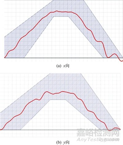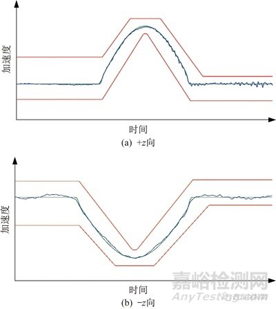 根據GB 38031—2020要求,將電池包通過工裝設備水平安裝在帶有支架的臺車上,根據試驗對象的使用環(huán)境給臺車施加規(guī)定的脈沖,并落在圖9所示的最大、最小容差允許范圍內。測試方向包括x和y方向。試驗結束后,應在試驗環(huán)境溫度下觀察2 h。