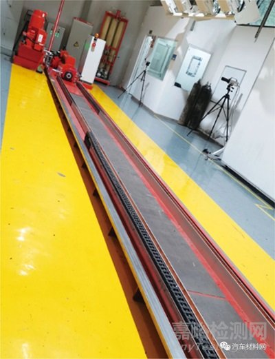 模擬碰撞試驗采用的設備為加速型碰撞模擬系統(tǒng),如圖8所示,導軌長度為14 m,最大加速距離為1.2 m,減速距離長度為11.044 m,測試托架的安裝面尺寸為2 200 mm×1 400 mm,最大負載質量為1 500 kg。