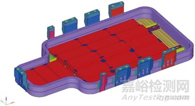 電池包的開發(fā)設計一般經過概念設計、詳細設計、有限元仿真驗證、試驗驗證等環(huán)節(jié)。試驗驗證是評判產生可靠性最重要的一個環(huán)節(jié),其中機械沖擊和模擬碰撞測試常是安全性測試中通過率較低的項目,如果僅依靠試驗方法進行驗證,不僅增加研發(fā)成本,還會增加時間周期。隨著計算機技術及計算力學等理論的飛速發(fā)展,基于有限元理論的CAE分析技術被廣泛應用于電動汽車安全領域[3-4]。冷曉偉[5]對某動力電池箱進行有限元分析,實現了動力電池箱靜態(tài)和動態(tài)多目標拓撲優(yōu)化,依據拓撲優(yōu)化的結果,對動力電池箱的底板進行重新設計,提高了動力電池箱的承重能力。孫昱晗[6]基于簡化后的電池包模型對電池包結構的機械性能進行有限元分析和結構優(yōu)化,設計出一款較為輕便、結構可靠的電池箱。蘭鳳崇等[7]結合電池包精細化三維模型和有限元仿真手段獲取了與試驗結果匹配的電池包振型及模態(tài),并模擬分析了車載工況下電池包碰撞過程中箱體及內部結構件的變形和應力分布情況。劉瑞慶[8]將碳纖維復合材料(CFRP)應用于動力電池殼體,采用有限元分析方法證明了CFRP在剛性柱碰撞下對電池包有效的保護,使得減輕質量的同時保證電池包滿足一定強度要求。