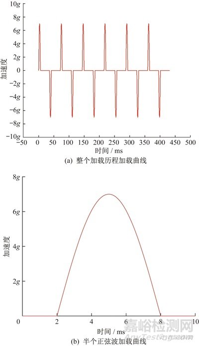根據試驗加載條件對電池包進行機械沖擊仿真邊界條件的設置。首先,將所有吊耳安裝孔中心節(jié)點創(chuàng)建為一個set集,通過關鍵字*BOUNDARY_SPC_SET約束其除了z向位移以外的全部自由度;接著,對電池包施加重力場作用,加速度大小為9 800 mm/s2,使得整包所有單元均受到重力場的影響;最后,對電池包固定吊耳施加z向沖擊加速度載荷,通過關鍵字*BOUNDARY_PRESCRIBEDMOTION_SET實現,其載荷曲線與試驗條件保持一致,整個機械沖擊加載加速度曲線和半個正弦波加載曲線如圖14所示。