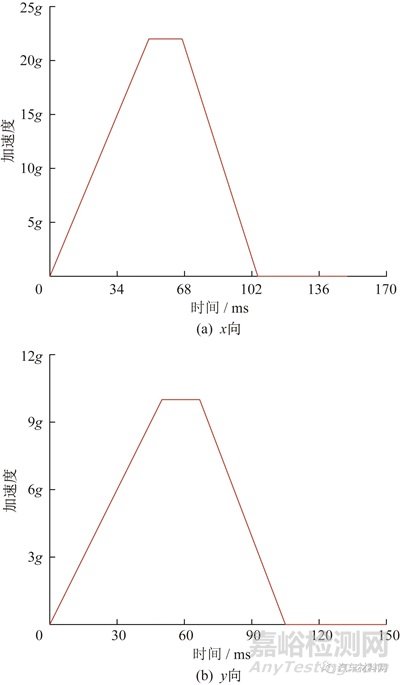 電池包模擬碰撞包括x向和y向兩種工況,兩個方向的加載加速度曲線如圖15所示。與機械沖擊相似,約束固定吊耳除x向或y向(與模擬碰撞方向相同)以外的全部自由度;并對整包施加重力場;最后,通過關鍵字*BOUNDARY_PRESCRIBEDMOTION_SET對吊耳處施加加速度載荷,并提交LS_DYNA計算。