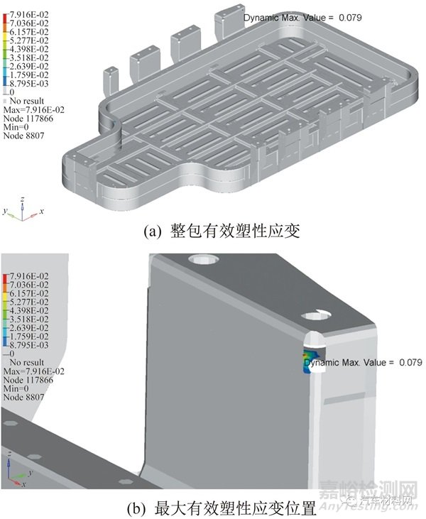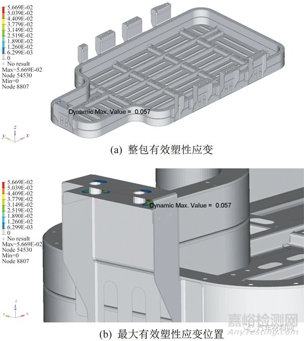 參考標準中規(guī)定的機械沖擊工況,對電池包進行z方向機械沖擊分析時,由于電池包通過吊耳處的螺栓連接固定安裝在整車上,故對吊耳上的螺栓襯套施加7g/15 ms的半正弦沖擊波形,對結構機械性能進行評估:如圖16所示,電池包呈現內凹運動趨勢,四周吊耳位置位移較大;最大塑性應變發(fā)生在安裝吊耳處,為5.7%,小于材料的斷裂延伸率,未發(fā)生斷裂失效現象。