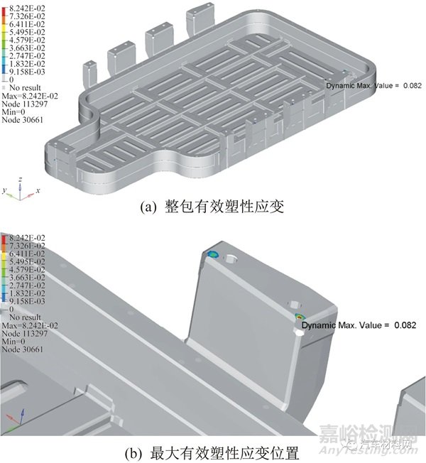 圖17和圖18分別為超高強鋼制電池包在x向和y向模擬碰撞仿真分析后箱體的有效塑性應變分布云圖。吊耳局部位置產生明顯的塑性應變,表明在模擬碰撞工況下,該局部區(qū)域應力集中,結構發(fā)生較大的塑性變形,最大塑性應變?yōu)?.2%,小于箱體材料的斷裂延伸率。因此,該超高強熱輥彎電池包箱體不會發(fā)生斷裂,電池包不會發(fā)生泄漏、著火和爆炸等現象,滿足機械性能要求。