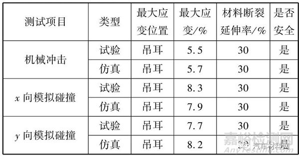 對比機械沖擊和模擬碰撞試驗及仿真結果,見表2。兩個試驗的應變最大位置均為吊耳。吊耳材料為SAPH440,斷裂延伸率典型值為30%,均未超過斷裂極限,試驗和仿真結果評估安全。機械沖擊試驗最大應變5.5%,仿真最大應變5.7%。x向模擬碰撞試驗最大應變8.3%,仿真最大應變7.9%;y向模擬碰撞試驗最大應變7.7%,仿真最大應變8.2%。仿真與試驗結果較為一致,數值模擬方法可以為機械沖擊和模擬碰撞工況提供指導。