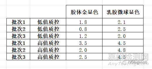 我們采用同一個(gè)人不同時(shí)間燒制3個(gè)批次的40nm(4/萬)的膠體金顆粒,同時(shí)采用某廠家銷售的3個(gè)不同批次的300nm的微球顆粒,前后采用一模一樣的工藝,同時(shí)進(jìn)行試紙條的生產(chǎn)制備,最終采用低值質(zhì)控和高值質(zhì)控分別進(jìn)行測試,結(jié)果如下: