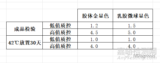 我們可以觀察出,兩者在42℃放置一個(gè)月的時(shí)候檢測,與剛生產(chǎn)時(shí)候的測試均有一定程度的下降,但是下降程度均可以接受,貌似膠體金的耐高溫測試比乳膠微球表現(xiàn)的更加優(yōu)秀一些,這可能源自于兩個(gè)載體材質(zhì)的差異。