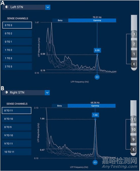 β頻段在 13-30 Hz 范圍內(nèi),通常被認(rèn)為與肌肉僵硬的存在相關(guān),較大的 LFP 幅度反映了嚴(yán)重程度的增加。當(dāng)刺激的增加導(dǎo)致肌肉僵硬和運(yùn)動(dòng)遲緩改善時(shí),隨后應(yīng)進(jìn)行 β LFP 峰值衰減。頻率為 31-200 Hz 的伽馬振蕩帶被認(rèn)為與運(yùn)動(dòng)障礙相關(guān),峰值越高代表運(yùn)動(dòng)障礙越嚴(yán)重。通過(guò)監(jiān)測(cè) β 和 γ 頻率振蕩的存在和幅度,治療團(tuán)隊(duì)獲得了額外的信息,使他們能夠記錄客觀數(shù)據(jù)并優(yōu)化患者的治療計(jì)劃。
