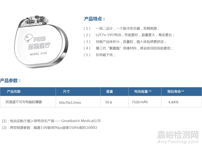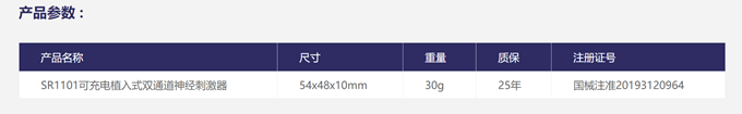 雙通道可充電腦起搏器;直徑:52mm,厚:11mm;重量:37g;電池容量:220mAh;預(yù)估壽命:20年質(zhì)保