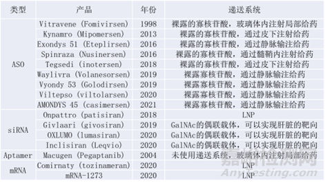 表1:FDA批準(zhǔn)上市的核酸藥物及其遞送系統(tǒng)
