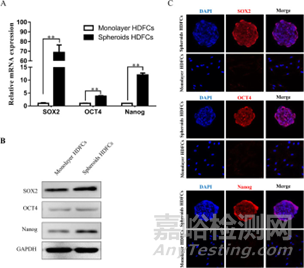 圖8:基于瓊脂糖的球狀體培養(yǎng)在體外增強(qiáng)了人牙泡細(xì)胞(HDFC)的干性。注:Sox2、Oct4 和Nanog 是維持干細(xì)胞多能性和干性的重要轉(zhuǎn)錄因子
