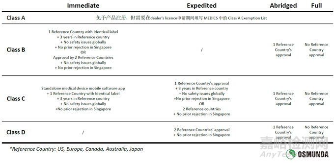 根據(jù)產(chǎn)品風(fēng)險(xiǎn)分類以及該產(chǎn)品在參考國家的上市情況,總共有四種不同的注冊路徑:Immediate、Expedited、Abridged以及Full??傮w上來說,同一產(chǎn)品在越多的參考國家獲得上市許可,則在新加坡注冊的流程越簡單快捷。