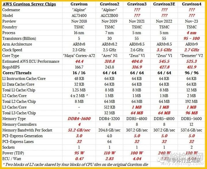 我們認(rèn)為 Graviton4 與前幾代芯片的比較如下: