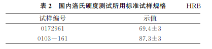 國外洛氏硬度標(biāo)準(zhǔn)試樣符合 ASTM E18-20的要求。日常校驗(yàn)硬度計時,在總試驗(yàn)力保持時間為2,3,5,6,9s時,校準(zhǔn)結(jié)果均在公差范圍內(nèi)。國外洛氏硬度測試所用標(biāo)準(zhǔn)試樣規(guī)格如表1所示。