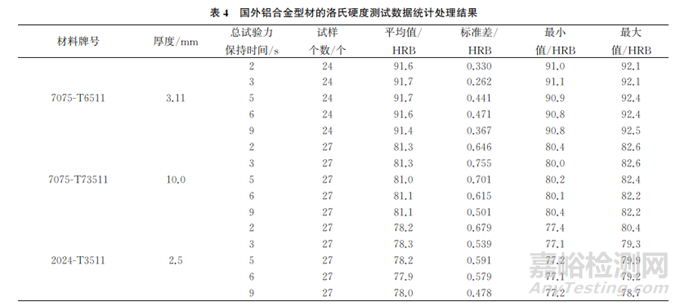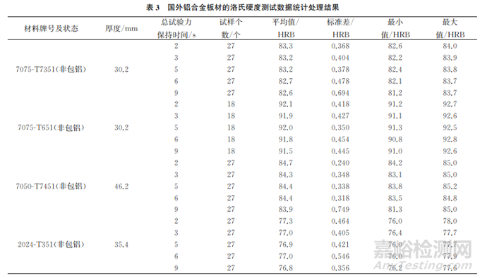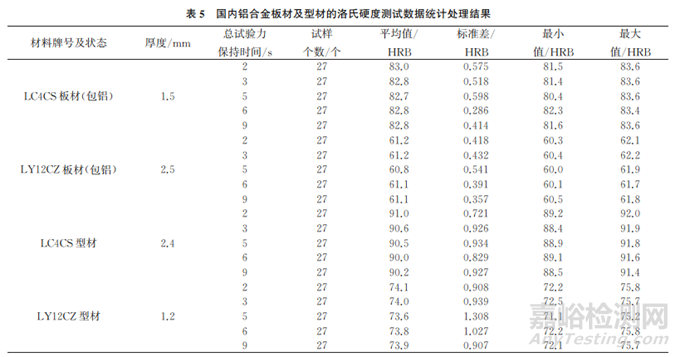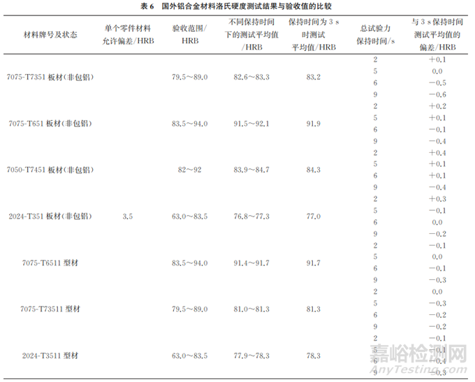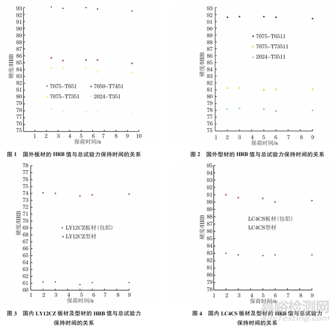 研究人員選擇生產(chǎn)中常用的鋁合金板材和型材進(jìn)行洛氏硬度測試,針對不同規(guī)格和狀態(tài)的材料,分別測量總試驗(yàn)力保持時間為2,3,5,6,9s時,這些材料的洛氏硬度。通過試驗(yàn)數(shù)據(jù)統(tǒng)計分析,得出不同總試驗(yàn)力保持時間與鋁合金洛氏硬度測試結(jié)果的關(guān)系。
