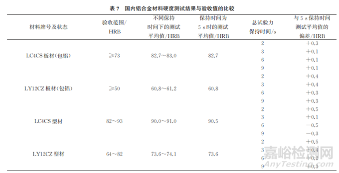 從表6,7可以看出,不同方法所要求的總試驗(yàn)力保持時間下測得的鋁合金硬度是不同的,將國外鋁合金材料硬度與3s保持時間下的測試結(jié)果相比較,保持時間越長,偏差越大;將國內(nèi)鋁合金材料硬度與5s保持時間下的測試結(jié)果相比較,5s保持時間的硬度測試結(jié)果是最低的,保持時間的絕對差值越大,偏差越大。