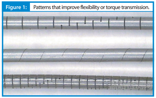 對于所有軸,剛度取決于材料的彈性模量,外徑和內(nèi)徑;在本文中,考慮到突破金屬軸的傳統(tǒng)限制,使其能夠在各種新的應(yīng)用中使用;使用復(fù)合材料的設(shè)計(jì)還可以在具有不同性能特征的軸段之間實(shí)現(xiàn)無縫過渡;如今,大量的醫(yī)療器械設(shè)計(jì)工作致力于優(yōu)化器械各部分之間的過渡問題,靈活性,輪廓形狀,不銹鋼軸,剛度轉(zhuǎn)換可以很容易地融入到該設(shè)計(jì)中;各種軸的剛度可以使用三點(diǎn)彎曲試驗(yàn)或其他基于撓度的方法來進(jìn)行評價(jià);有了這些信息,相鄰軸的剛度可以繼續(xù)完美地匹配,以達(dá)到幾乎完美的過渡。此外,軸的各個(gè)部分的剛度可以通過指定的距離精確地控制改進(jìn);設(shè)計(jì)工程師已經(jīng)優(yōu)化了許多可以提高靈活性或扭轉(zhuǎn)傳輸性能的設(shè)計(jì)(見圖1)。各向異性設(shè)計(jì)(在不同方向上具有不同性能特征的設(shè)計(jì))也可以通過切割的方式展現(xiàn)管體在多個(gè)平面上顯示不同程度的靈活性;必要時(shí),可以在軸上加外套層以密封軸的表面,以減少外表面摩擦或促進(jìn)其他部件與軸的熱連接。