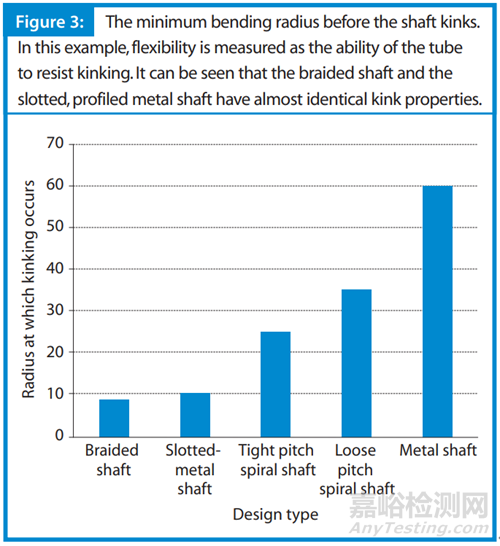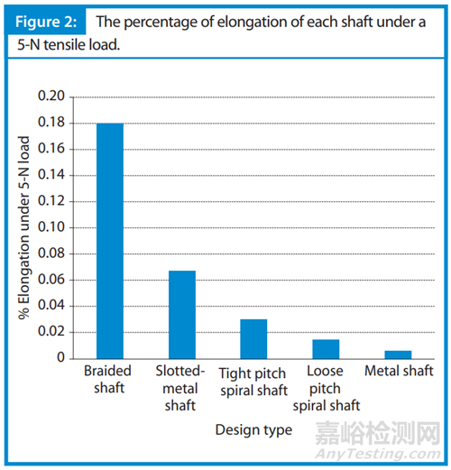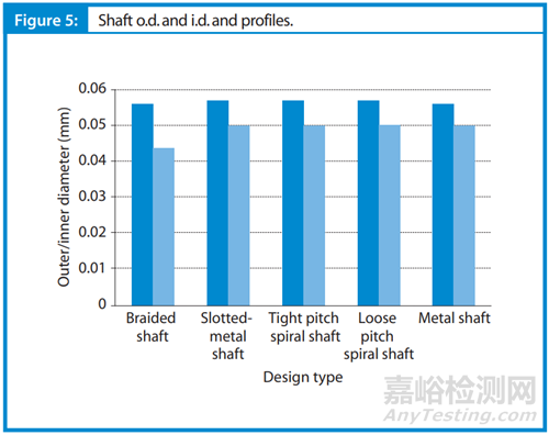 圖5顯示了不同軸的外徑和內(nèi)徑的值,為了獲得更加有效的對比,不同軸的外徑盡可能保持一致,異形軸設(shè)計(jì)的外徑為0.001英寸(0.0254毫米),比其他設(shè)計(jì)要高,這是因?yàn)?.0005英寸(0.0127 mm)厚的單壁聚酯熱縮層套在異形軸的外表面;編織工藝的特質(zhì)意味著編織軸設(shè)計(jì)具更小的內(nèi)徑,因此,其具有更小的內(nèi)工作通道;