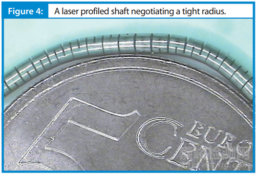 這里描述的是通過激光切割的方式制備柔性的不銹鋼軸;在此應(yīng)用中,304不銹鋼材質(zhì)的海波管以正常方式進(jìn)行加工和鈍化處理;使用脈沖Nd-YAG激光器(Rofin-Baasel4)在不銹鋼管上切割出預(yù)設(shè)的圖案。激光束切割寬度的切縫小于20µm,同時(shí)會(huì)造成最小為5µm的熱影響區(qū)。在這個(gè)例子中,激光切割系統(tǒng)最初設(shè)計(jì)用于切割冠狀動(dòng)脈不銹鋼支架,但它已經(jīng)被廣泛應(yīng)用于切割定制化的長條形不銹鋼管材;在這種設(shè)計(jì)中,激光束被固定,而管子在激光束下旋轉(zhuǎn)并向前進(jìn);當(dāng)激光正確聚焦時(shí),激光會(huì)穿過管壁。一旦管材輪廓已被切割成型便進(jìn)行清洗和鈍化,并且可以在切割的表面套上一個(gè)高分子外套;這種外套可以通過很多方式在導(dǎo)管軸上實(shí)現(xiàn)。以目前的技術(shù),最具成本效益的選擇是將高分子外套直接通過包覆擠出的方式覆蓋在不銹鋼軸上;其他方法包括熱收縮,其中聚合物外殼通常在100℃的溫度下收縮到軸上。
